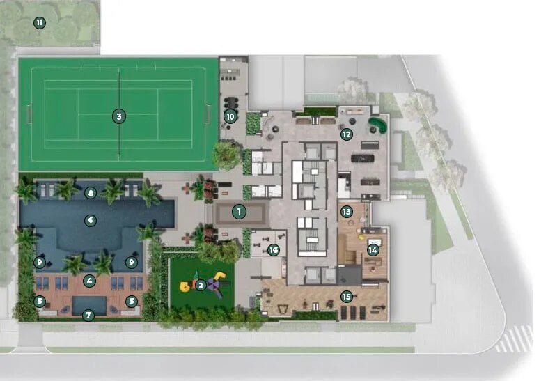 Quadra de tênis com medidas oficiais, complexo aquático e fitness com spinning