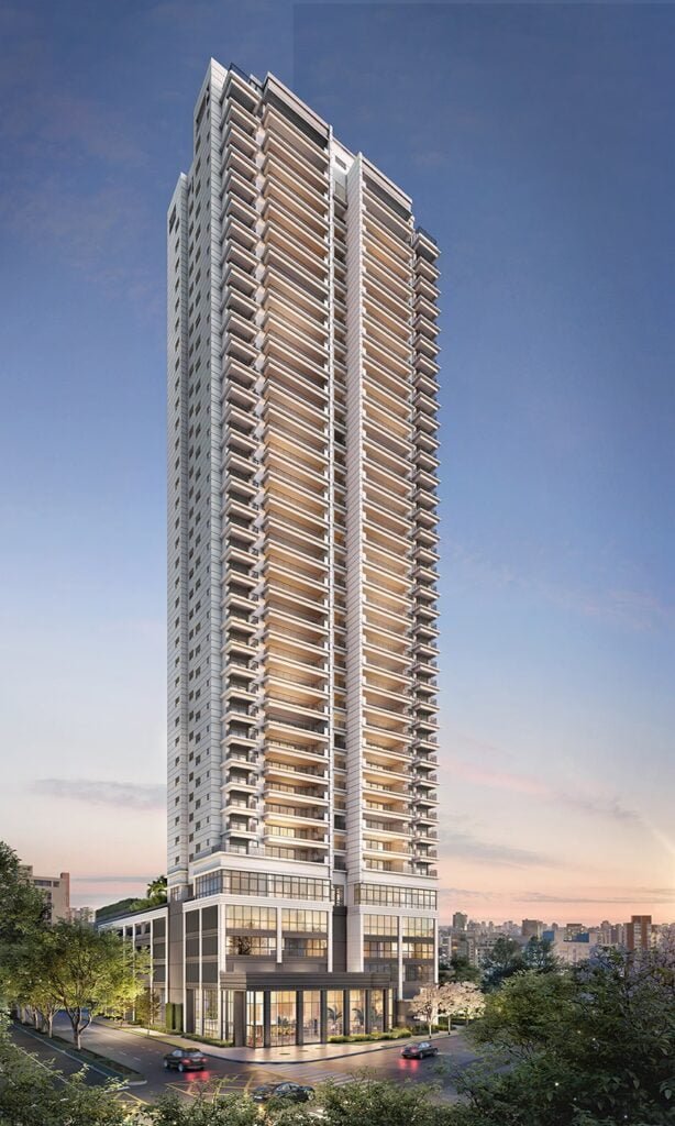 Torre única de 38 andares, 132 apartamentos com hall privativo